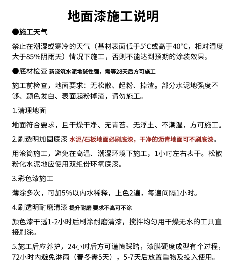 请勿在潮湿或寒冷的天气(基材表面低于5°C或高于4°C,相对湿度大于85%阴雨天)情况下施工,否则不能达到预期的涂装效果。